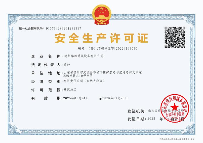 公司以诚信为本,不断壮大,珍惜来之不易的荣誉,衷心感谢社会各界朋友和客户长期以来的关怀和支持,“铭城通风设备”将继续以产业化、专业化、现代化的道路发展,树立以“服务优质,品质”的经营理念。我们将一如既往,保证向用户提供高品质的消防、通风、制冷设备。